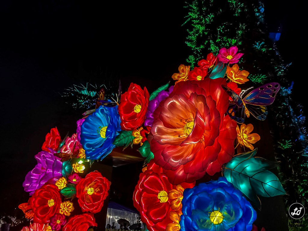 Inspired by the Chinese phrase, which means a colourful and prosperous scene, the Supertree Grove is decorated with a floral arch made up of more than 20 lantern peonies.